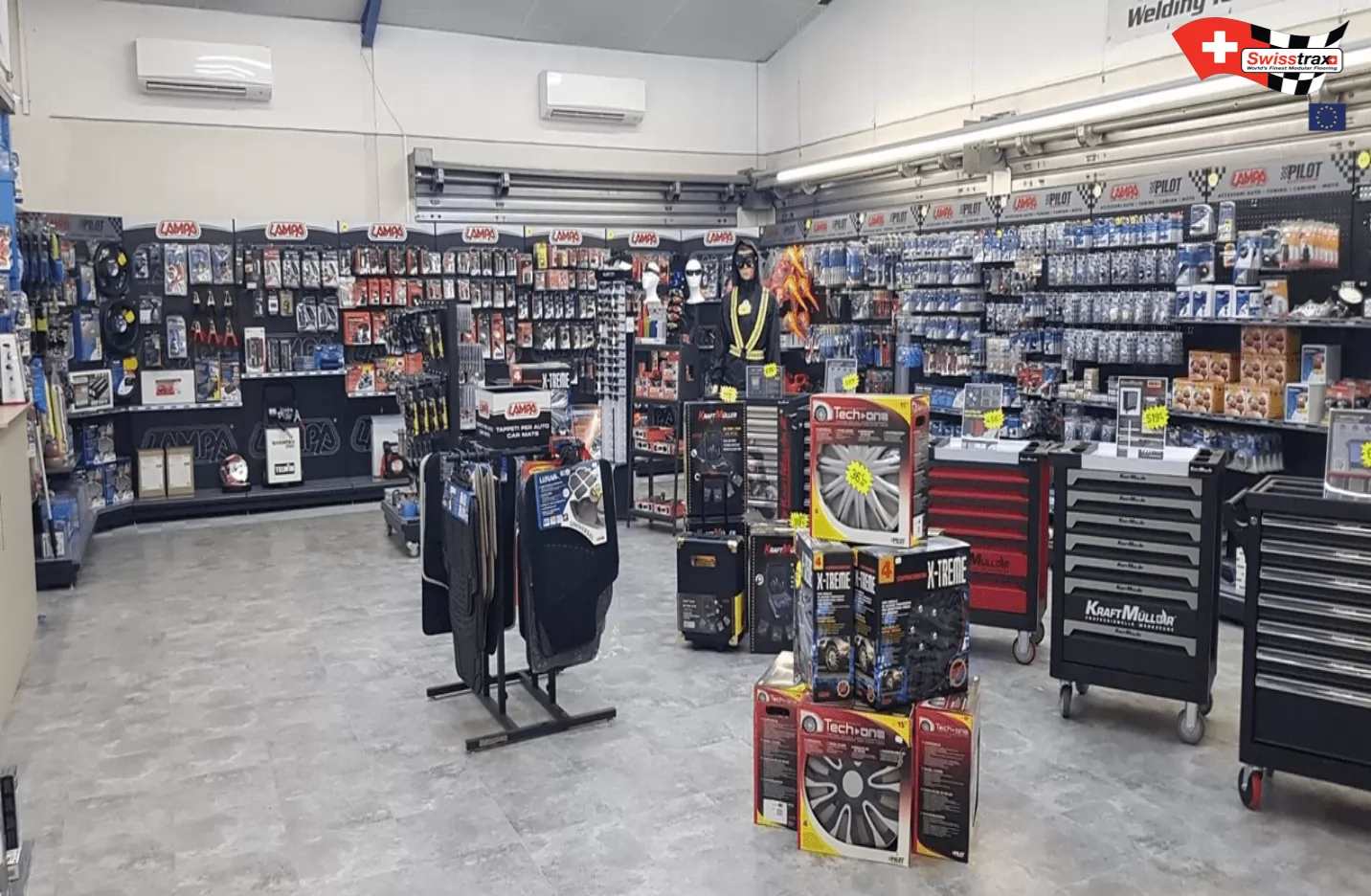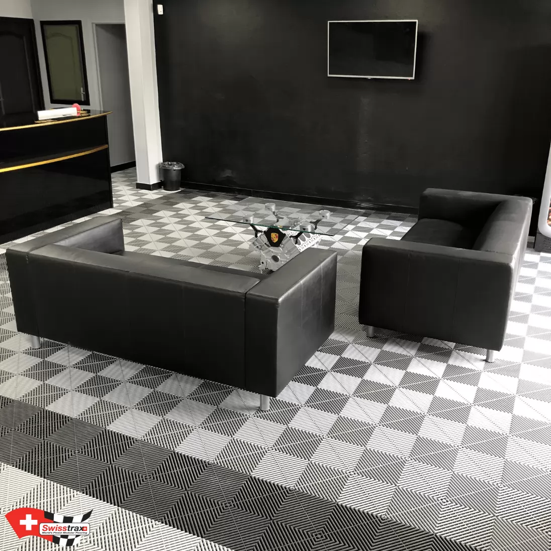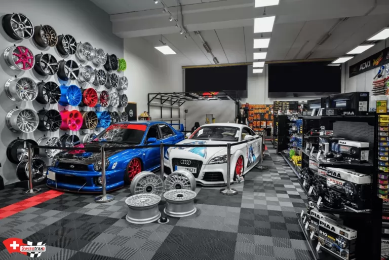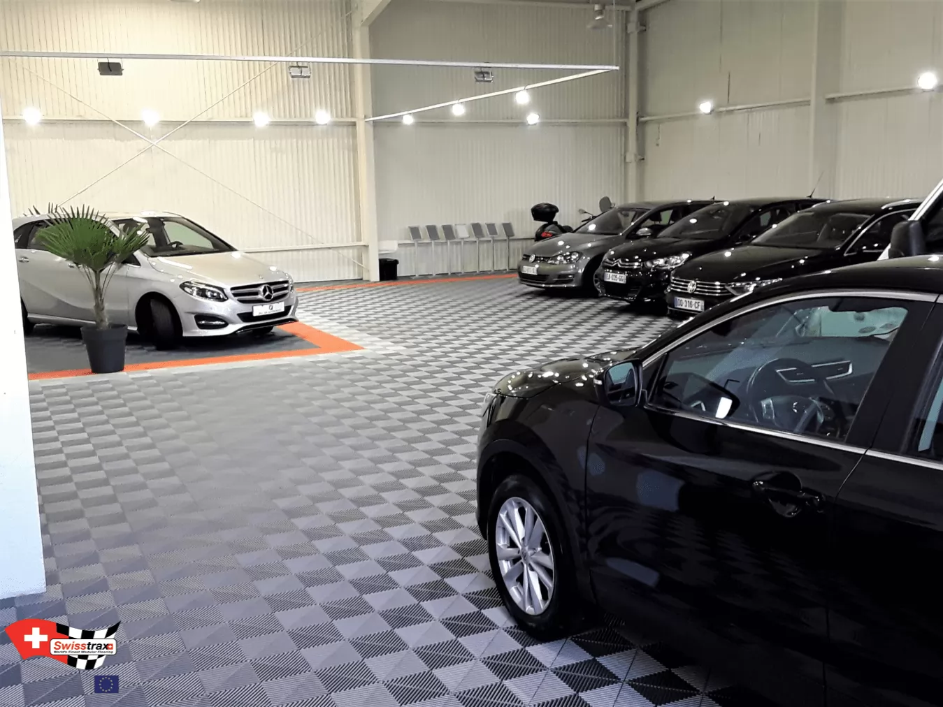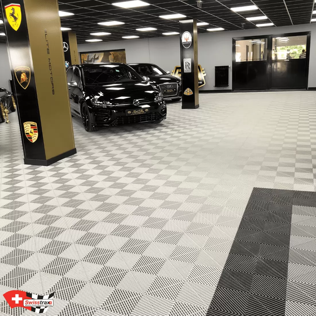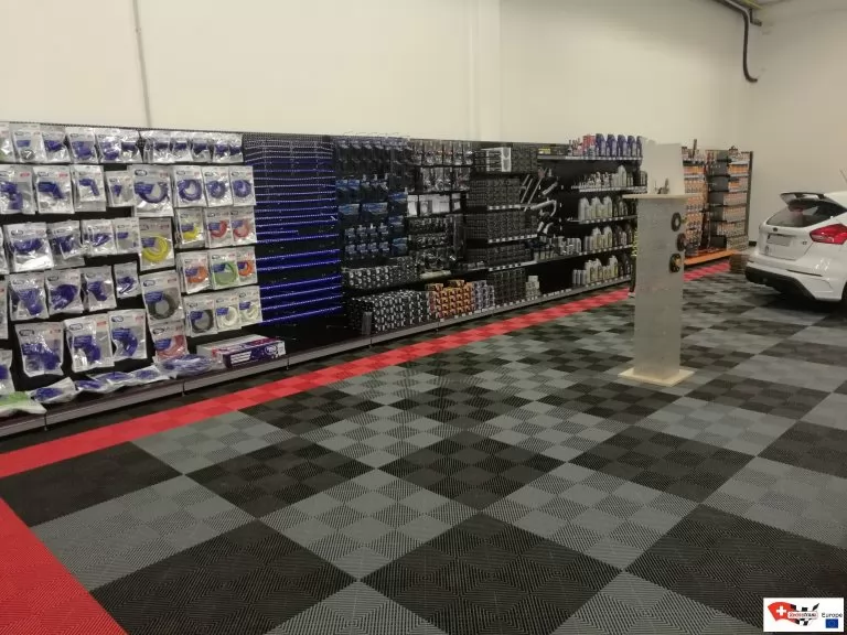 Wählen Sie Ihr Plattenmodell entsprechend der gewünschten Atmosphäre. Sie können auch die verschiedenen Arten von Showroom-Platten mischen, deren Abmessungen identisch sind! Autos, Motorräder, Fahrräder, Quads … dieser neue Bodenbelag wird Sie mit seiner Modularität und seinem Design nach Belieben verführen. Erstellen Sie Ausstellungsbereiche in Ihrem Ausstellungsraum! Definieren Sie beispielsweise Ihre Ersatzteilbereiche, Ihre Marken und Ihre Empfangsbereiche dank der verschiedenen verfügbaren Plattenfarben.
