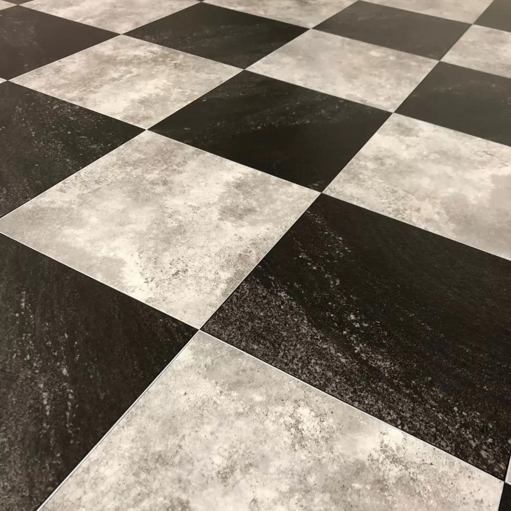 Wir bieten 2 Farben auf Lager, polierten Betonbodeneffekt und schwarzen Marmor. Diese 2 Farben können in Form eines Schachbretts zusammengestellt werden. Überzeugen Sie sich selbst auf dem Foto unten. Machen Sie den Boden Ihrer Wahl, ein oder zwei Farben, keine Mindestbestellmenge. Reproduzieren Sie Marmor- oder Fliesenböden in wenigen Stunden! Die Reinigung Ihres Bodens ist einfach und schnell. Verwenden Sie dieselben Haushaltsprodukte wie in Ihrem Haus mit einem flachen Mopp.