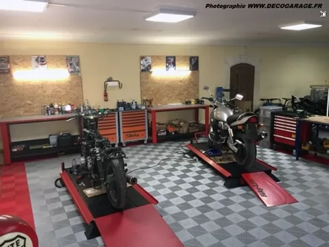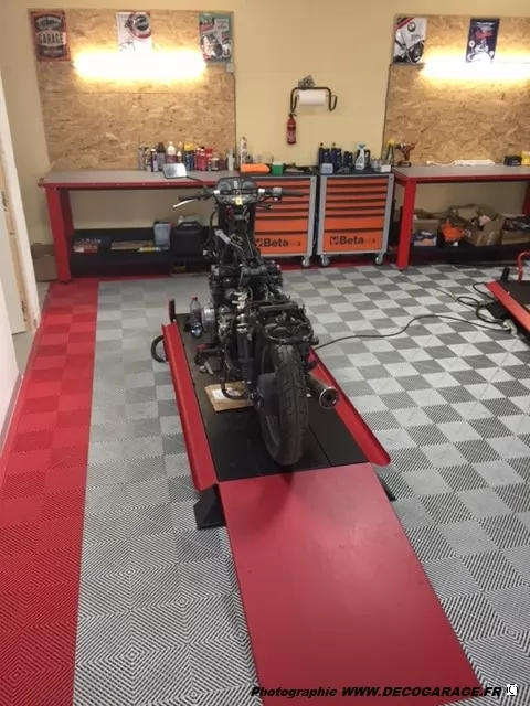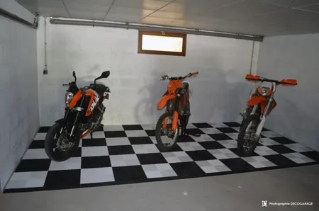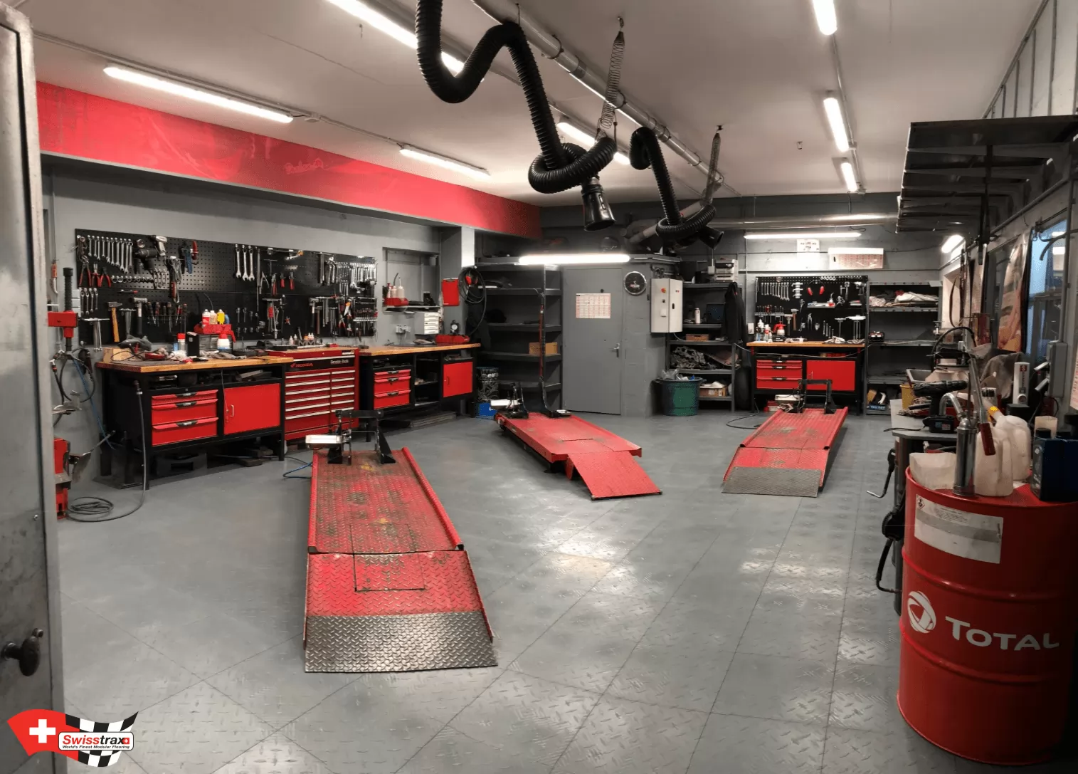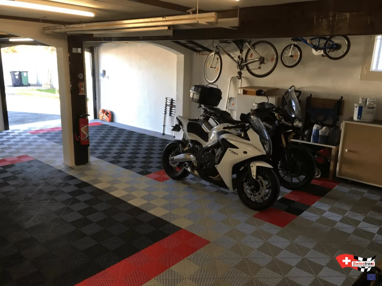 SWISSTRAX-Böden begrüßen Ihre Motorräder, Straße, Enduro / MX usw. Die Platten sind extrem widerstandsfähig, 25T / M2, die Farben sind in den Platten gemacht. Garagen Leidenschaft, Motorradwerkstatt, die Swisstrax Bodenkollektion ist für Sie.