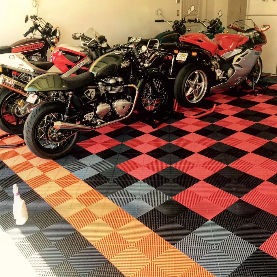 Verwenden Sie den SWISSTRAX-Garagenboden, um ein Traumheim in Ihrer Garage zu schaffen. Lebe deine Motorradleidenschaft, indem du die Farben deiner Bodenplatten mit denen deiner Lieblingsmarke kombinierst.