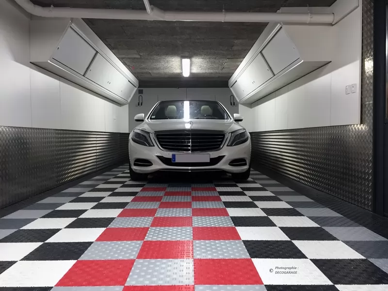 Es sind keine speziellen Werkzeuge erforderlich. Sie benötigen lediglich ein Zollstock, einen Stift, eventuell eine Stichsäge oder eine Kreissäge, um die Schnitte auszuführen. Sie legen Ihre Platten auf Ihren Betonboden und stecken sie einfach zusammen. Mach dir keine Sorgen über den Widerstand: 25T / M²! Ihre Installation ist abgeschlossen: Nutzen Sie das Ergebnis und Ihre Garage, keine Trocknungszeit!
